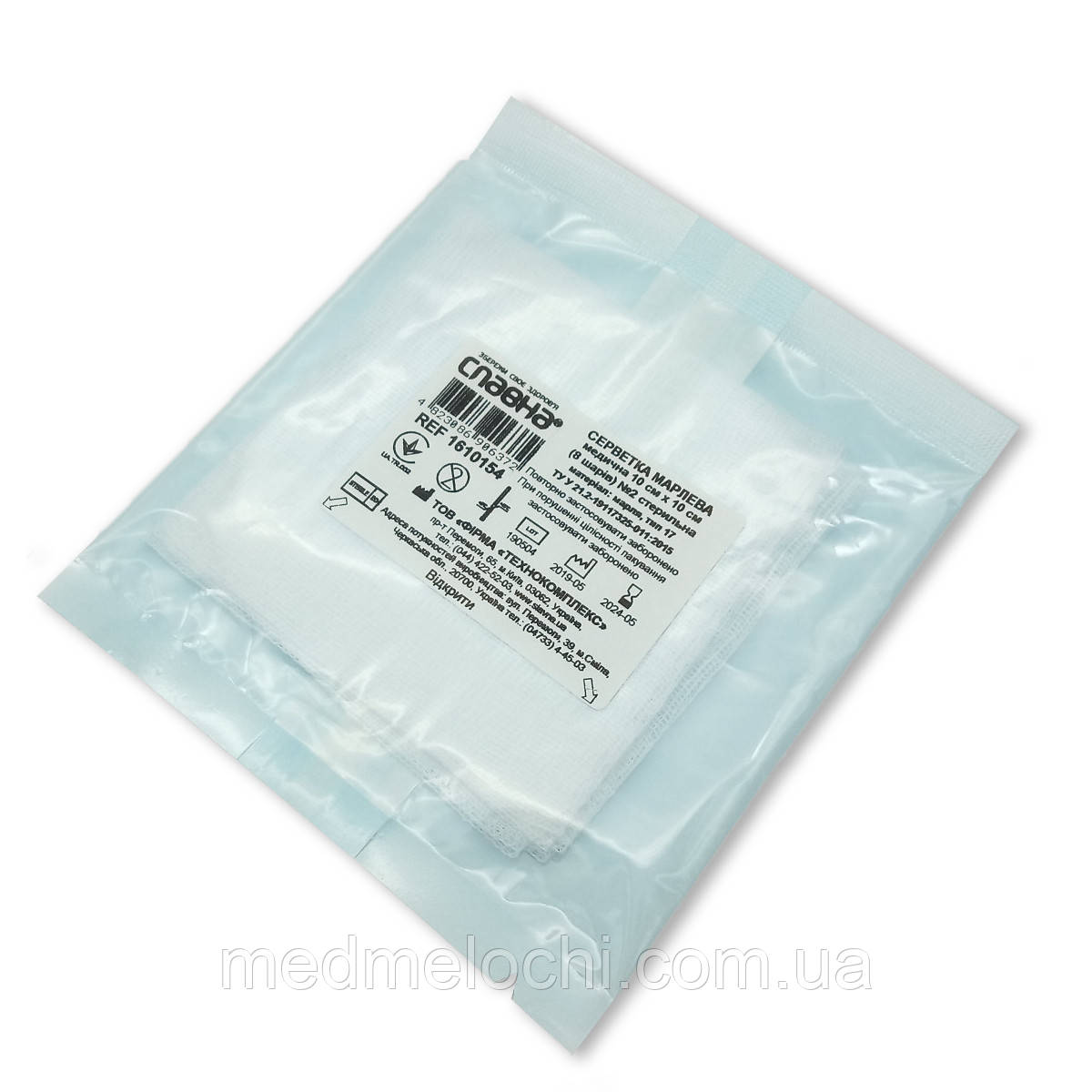 Серветка марлева медична 10 х 10 см (8 шарів) стерильна ТМ «Славна». Упаковка № 2 (2 серветки в упаковці). Матеріал – марля, тип 17. Термін стерильності – 5 років з дати виготовлення. Повторне використання заборонено. ТУ У 21.2-19117325-011:2015.